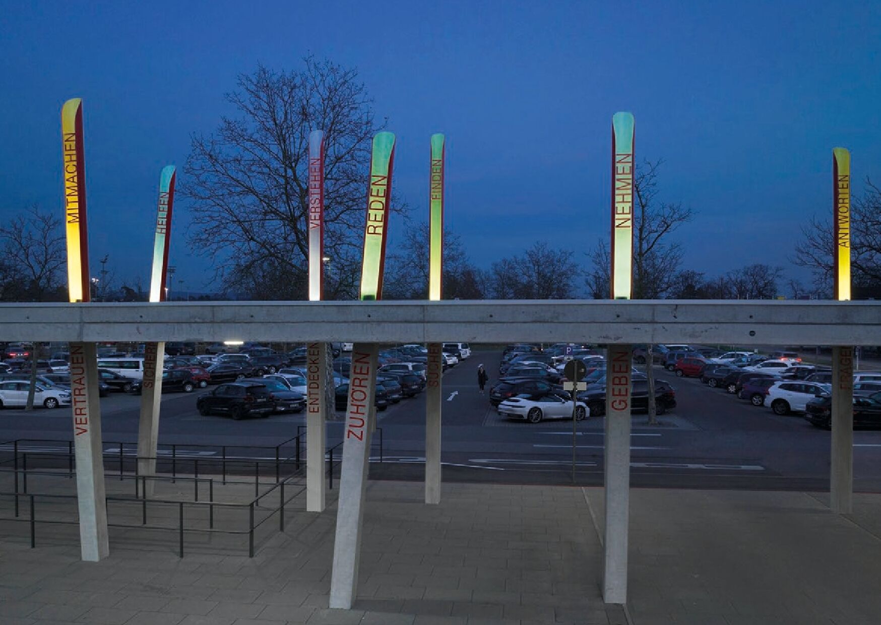 In den Himmel ragen die Großskulpturen "Justitia" und "Feuer und Wasser", auch das raumübergreifende Gesamtkonzeption einer Krankenhaus Intensivstation ist gezeigt. Diese und weitere Projekte, zarte Zeichnungen, erste Lichtinstallationen...