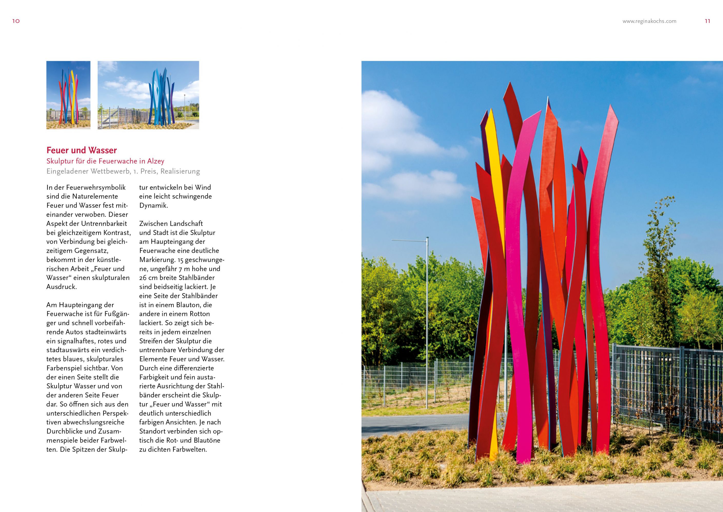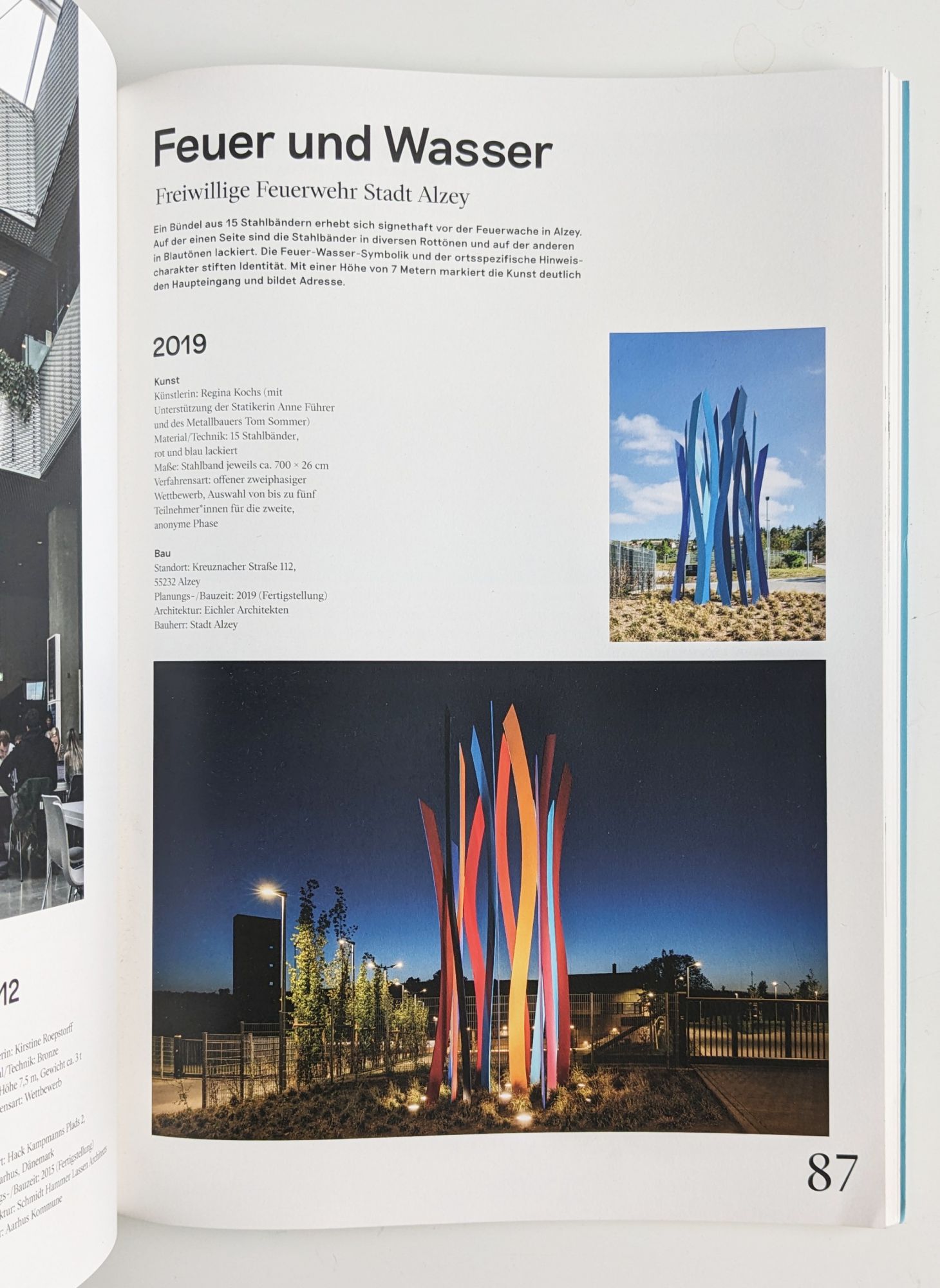 "Feuer und Wasser" S. 87, Autor: Martin Seidel, Herausgeberin: Baukultur Nordrhein-Westfalen, Gelsenkirchen 2021. Thema der Publikation: Wesen und Funktion von Kunst am Bau, von der Entwicklung bis zur Fertigstellung. ISBN: 978-3-939745-20-4